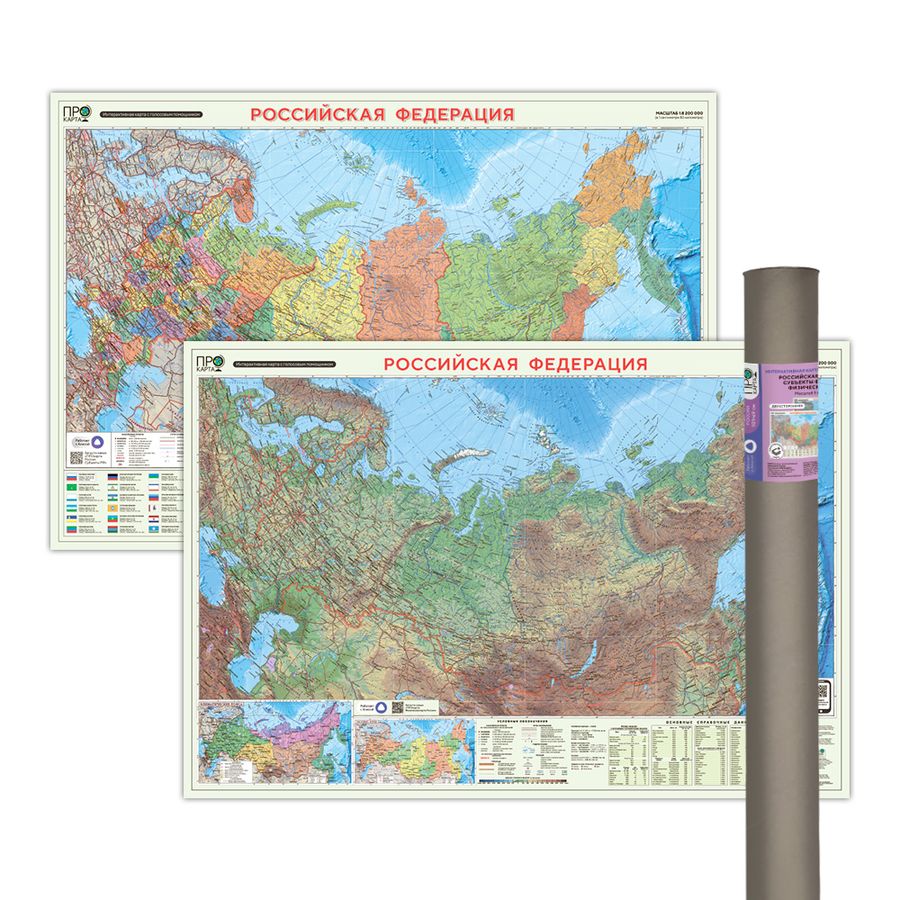 Двусторонняя карта объединяет физическую и политико-административную карты РФ на одном поле. Благодаря персональным навыкам голосового помощника, карта позволяет изучить дополнительную информацию в удобной форме – например, в виде голосового справочника или викторины. Ламинация сохраняет яркость цветов и позволяет рисовать на карте фломастерами на водной основе. Физическая карта демонстрирует социально-экономические данные РФ: новые гос. границы, населенные пункты, основные автомобильные и железные дороги, паромные переправы, морские пути, морские и речные порты, международные аэропорты; присутствует информация о крупнейших географических объектах и часовых поясах России. На карте наглядно показан рельеф и водоописание РФ. П/А карта отображает административное деление субъектов федерации, их символику, численность населения.