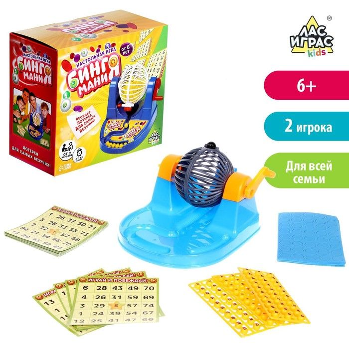 Испытайте удачу в весёлой лотерее «Бингомания»! Перед вами увлекательная игра, которая завоевала популярность во всем мире! Устройте соревнование всей семьёй и определите настоящего везунчика. Правила удачной комбинации Ведущий раскручивает лототрон и называет цифру, выпавшую на шаре. А все участники отмечают её у себя на карточках специальными жетонами. Как только одному игроку удаётся собрать ряд чисел по горизонтали, вертикали или диагонали он кричит: «Победа!», — и выигрывает соревнование. В игре могут принимать участие 2 и более игрока. Время игры: от 15 минут. В набор входит: лототрон; табло с числами; 90 шаров с номерами; 35 листов с комбинациями; 6 наборов жетонов; правила игры. Играя в «Бингоманию», ребёнок развивает образное и логическое мышление, скорость реакции, запоминает цифры и тренирует навык устного счёта. Товар предназначен для детей старше 6 лет. Дополнительно Размер лототрона: 20,5 × 16 × 13,5 см. Шарики с цифрами диаметр — 1 см. Фишки диаметр — 1,3 см. Карточки двусторонние: 10 × 10 см.