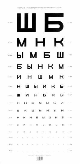 Таблица Сивцева - наиболее распространенная таблица, применяемая для проверки остроты зрения. Разработана советским офтальмологом в 1925 году. Таблица Сивцева представляет собой стандартный набор печатных знаков для определения остроты зрения человека. Таблица Сивцева состоит из комбинации семи разных букв разного размера, но равных по своей ширине и высоте (12 строк и 3 дополнительных).