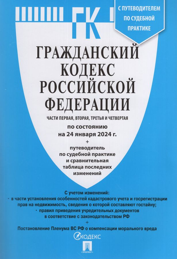 Текст Кодекса сверен с официальным источником и приводится по состоянию на 24 января 2024 г. с использованием общепринятых сокращений. Представленное вашему вниманию издание учитывает только изменения, внесенные опубликованными в официальных источниках на дату подписания издания в печать федеральными законами. Текст статей приводится на дату, обозначенную на обложке данной книги (дата актуализации). Если есть изменения, вступающие в силу позднее, то вместе с редакцией нормы, действующей на эту дату, приводится норма в новой редакции и указывается дата, с которой она вступает в силу. Издание содержит путеводитель по актуальной судебной практике Верховного Суда РФ, а также действующим постановлениям Пленума Высшего Арбитражного Суда РФ - соответствующие статьи кодекса помечены знаком , после которого приводятся название, реквизиты и пункты необходимого документа.