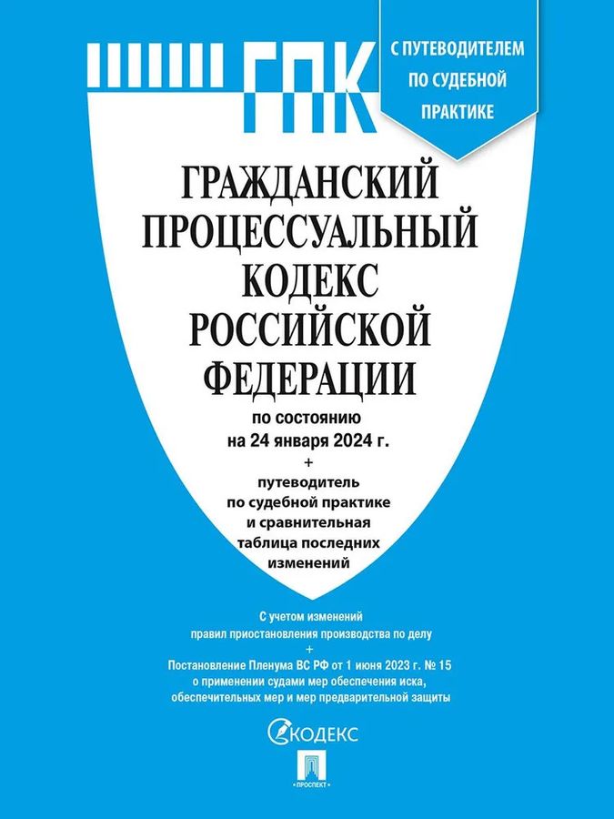 Текст Кодекса сверен с официальным источником и приводится по состоянию на 24 января 2024 г. с использованием общепринятых сокращений. Представленное вашему вниманию издание учитывает только изменения, внесенные опубликованными в официальных источниках на дату подписания издания в печать федеральными законами. Текст статей приводится на дату, обозначенную на обложке данной книги (дата актуализации). Если есть изменения, вступающие в силу позднее, то вместе с редакцией нормы, действующей на эту дату, приводится норма в новой редакции и указывается дата, с которой она вступает в силу. Издание содержит путеводитель по актуальной судебной практике Верховного Суда РФ, а также действующим постановлениям Пленума Высшего Арбитражного Суда РФ - соответствующие статьи кодекса помечены знаком , после которого приводятся название, реквизиты и пункты необходимого документа. В настоящем издании дополнительно приводится Постановление Пленума Верховного Суда РФ от 1 июня 2023 г. № 15 "О некоторых вопросах принятия судами мер по обеспечению иска, обеспечительных мер и мер предварительной защиты".