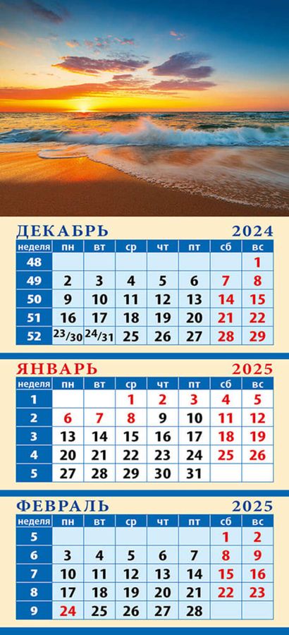 Календарь квартальный на магните на 2025 год. Размер календаря: 116х245 мм. Верхняя половина - фотография, нижняя - календарные месяцы. Бумага: мелованная.