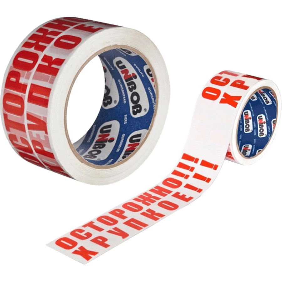 Клейкая лента упаковочная "Unibob. ОСТОРОЖНО ХРУПКОЕ" 48 мкм, 50 ммx66 м, красная надпись на белом фоне, реальная намотка, картонная втулка/82132