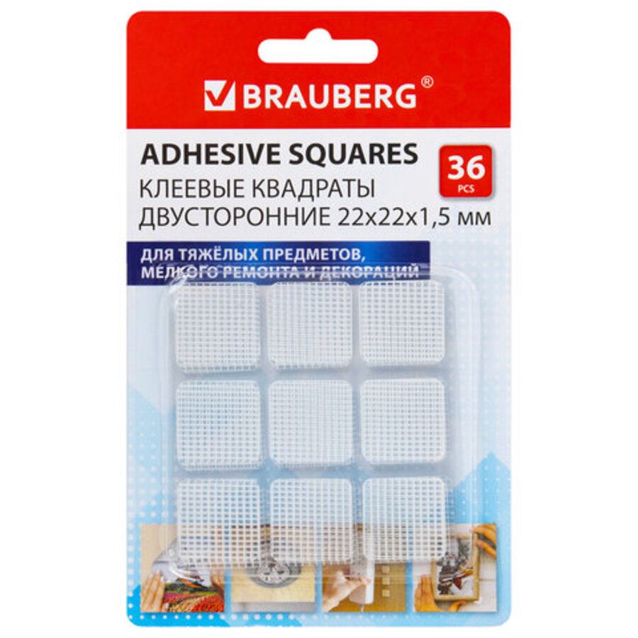 Клеевые квадраты двусторонние BRAUBERG применяется для фиксации предметов и крепежа к различным типам поверхностей, в том числе прозрачным. Идеально подходят для фиксации кухонных инструментов, элементов декора, смартфонов (например, в автомобиле). Для крепления удлинителей и хабов, картин, крючков. Стойкие к воздействию погодных условий: температуры, влаги, УФ, химических веществ. После использования удаляются без следа. Удерживаемый вес – 0,8 кг на 1 см2.