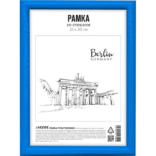 Рамка пластиковая "deVENTE" 21x30 см, формат A4, серия 1, стекло, задняя панель - переплетный картон, с креплением для подвеса, голубая, в термоусадочной пленке