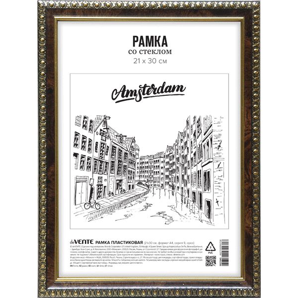 Рамка пластиковая "deVENTE" 21x30 см, формат A4, серия 900, стекло, задняя панель - переплетный картон, с креплением для подвеса, под орех с золотым напылением, в термоусадочной пленке