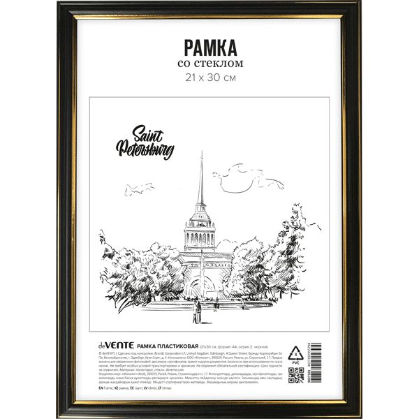 Рамка пластиковая "deVENTE" 21x30 см, формат A4, серия 2, стекло, задняя панель - переплетный картон, с креплением для подвеса, черный, в термоусадочной пленке