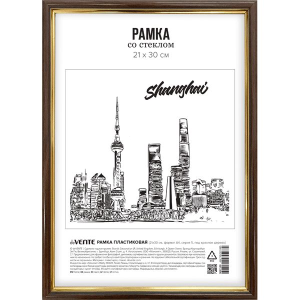 Рамка пластиковая "deVENTE" 21x30 см, формат A4, серия 5, стекло, задняя панель - переплетный картон, с креплением для подвеса, под красное дерево, в термоусадочной пленке