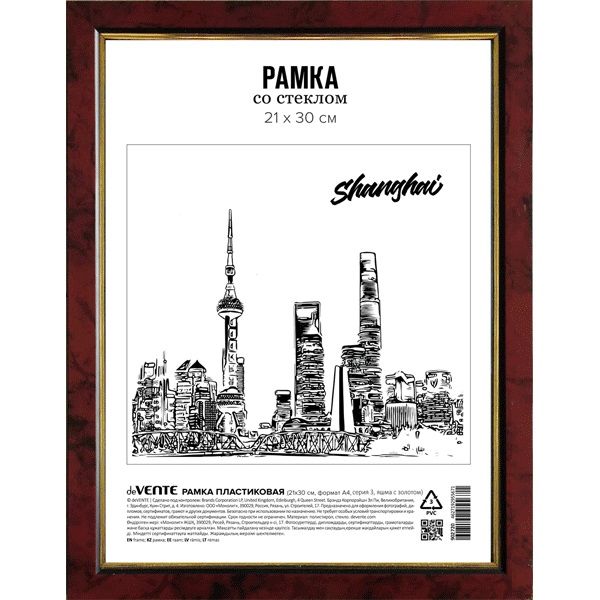 Рамка пластиковая "deVENTE" 21x30 см, формат A4, серия 3 (багет 14 x 20 мм), стекло, задняя панель - переплетный картон, с креплением для подвеса, под яшму с золотом, в термоусадочной пленке
