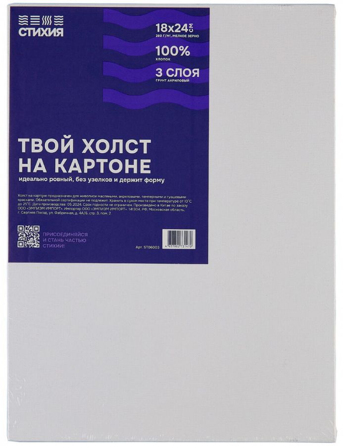 Холст на картоне «СТИХИЯ» — идеальный выбор как для новичков, так и для профессиональных художников. Ключевые особенности: -100% хлопок, мелкое зерно: холст выполнен из высококачественного хлопка с мелкозернистой текстурой, что обеспечивает отличное сцепление краски и гладкую поверхность для работы. -3 слоя акрилового грунта: подготовленная поверхность для нанесения акриловых, масляных и других видов красок, делает холст готовым к использованию сразу после покупки. -Ровная поверхность без узелков: отсутствие дефектов (узелков) на поверхности холста позволяет создавать работы с высоким уровнем детализации и чистыми линиями. -Качественная грунтовка: грунтовка высокого качества обеспечивает долговечность и стабильность покрытия, делая ваш холст идеальным для различных художественных техник. -Прочный картон: основа холста сделана из прочного картона, которая обеспечивает устойчивость и предотвращает деформацию, что делает этот холст удобным для переноски и хранения. -Российский бренд: создан командой профессионалов с любовью и вниманием к деталям, гарантируя высокое качество и соответствие всем стандартам. Возможности применения: -Идеально для учёбы и хобби: холст на картоне «СТИХИЯ» подходит для начинающих и опытных художников, студентов художественных школ и просто любителей рисовать. Он станет отличным выбором для учебных занятий и домашних художественных проектов. -Удобство и портативность: лёгкий и компактный, этот холст можно легко взять с собой на пленэр или использовать в домашних условиях. Он идеально подходит для этюдов и быстрых зарисовок. -Прекрасный подарок: практичный подарок для художников и любителей творчества.