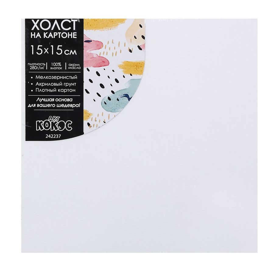 Холст, картон, 15*15 см, 100% хлопок, 280 г/кв.м, грунтованный, КОКОС