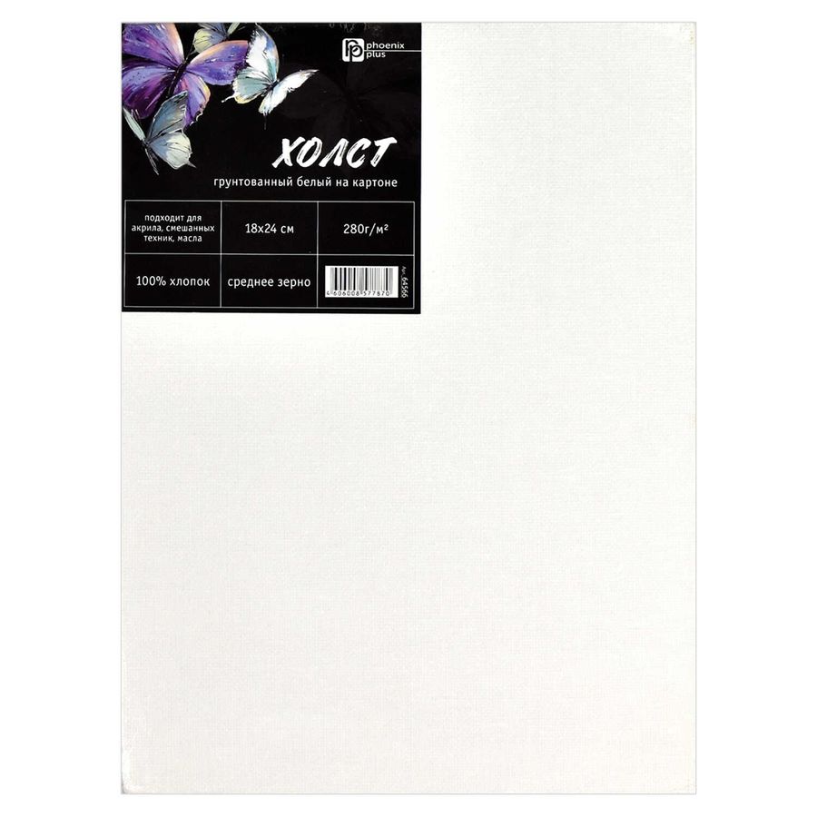 Холст художественный на картоне, белый, Феникс+ арт. 64566/ 50 БАБОЧКИ (18х24 см, хлопок 100%, 280г/м2, зерно: среднее, форма: прямоугольная, грунтованный, для акрила, масла, смешанных техник, место для персонализации, ПЭТ-плёнка).