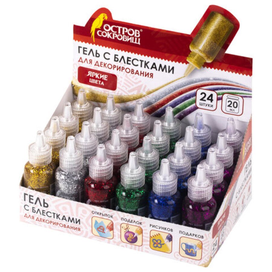 В дисплее содержится 24 тубы геля с блёстками объёмом 20 мл, представлены в 6 различных цветах: красный, золотистый, серебристый, зелёный, синий, фиолетовый. Удобная упаковка позволяет легко работать с гель-клеем: просто открутите крышку, и нанесите гель-клей на изделие через тонкий наконечник. По окончании работы удалите лишний гель с наконечника и плотно закройте колпачок, чтобы предотвратить засыхание геля. После нанесения на поверхность гель высохнет в течение нескольких часов в зависимости от толщины нанесённого слоя, а на поделке останутся искрящиеся блёстки. Гель-клей не токсичен, легко смывается с рук и одежды тёплой водой с мылом.