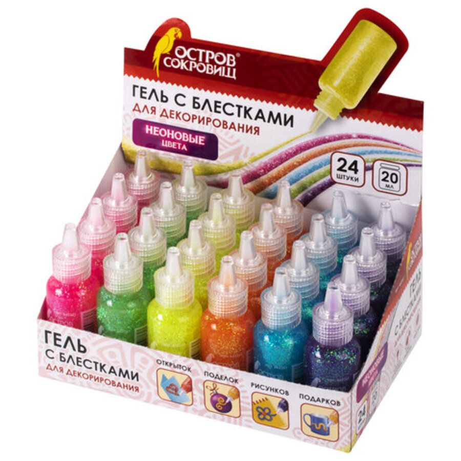 В дисплее содержится 24 тубы геля с блёстками объёмом 20 мл, представлены в 6 различных неоновых цветах: голубой, фиолетовый, розовый, оранжевый, жёлтый, зелёный. Удобная упаковка позволяет легко работать с гель-клеем: просто открутите крышку, и нанесите гель-клей на изделие через тонкий наконечник. По окончании работы удалите лишний гель с наконечника и плотно закройте колпачок, чтобы предотвратить засыхание геля. После нанесения на поверхность гель высохнет в течение нескольких часов в зависимости от толщины нанесённого слоя, а на поделке останутся искрящиеся блёстки. Гель-клей не токсичен, легко смывается с рук и одежды тёплой водой с мылом.