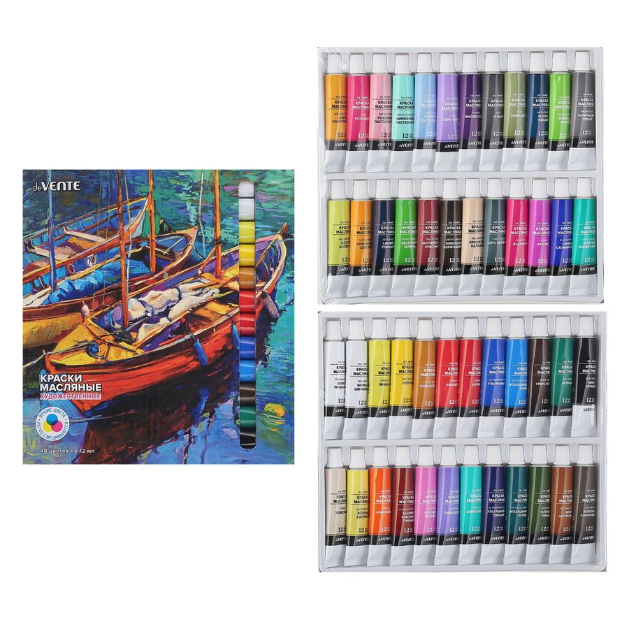 Краски масляные художественные "deVENTE" В наборе 48 цветов по 12 мл. В алюминиевых тубах. - серия для учащихся профессиональных художественных заведений и начинающих художников - изготовлены на основе льняного масла и тонкотертых пигментов - прекрасная разносимость, интенсивность и чистота цвета - яркие и насыщенные цвета легко смешиваются - палитра красок в наборе включает в себя наиболее популярные цвета - допускают возможность работы в разных техниках - краски в наборе имеют одинаковое время высыхания (6 дней), что облегчает работу с ними - не меняют цвет после высыхания В картонной коробке.