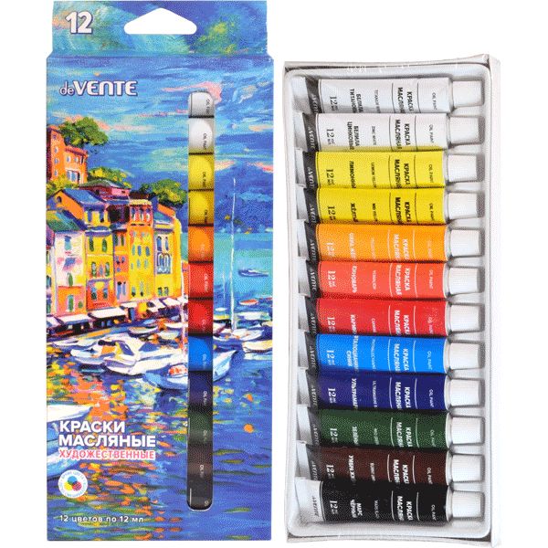 Краски масляные художественные "deVENTE" 12 цветов по 12 мл, в алюминиевых тубах, в картонной коробке с окном и блистерным подвесом