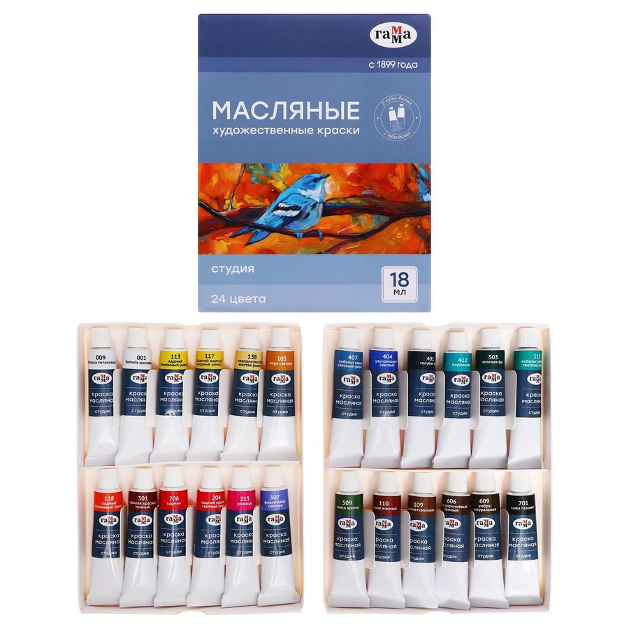 Набор масляных красок ГАММА серии «Студия» из 24 цветов подойдёт для обучения и начинающих художников. Краски представлены в тубах объёмом 18 мл. Они изготавливаются из льняного масла, органических и неорганических пигментов. Кадмиево-кобальтовая группа заменена имитацией, что делает краски безопасными. Цветовая палитра набора включает в себя как укрывистые краски, так и прозрачные. Упакован в красочную картонную коробку. • Количество цветов: 24;• Упаковка: туба;• Объём тубы: 18 мл.
