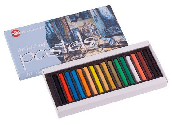 Пастель "Олки" художественная 16 цветов, картон Мягкая пастель "ОЛКИ" - разновидность сухой пастели, предназначенная для выполнения работ в традиционной технике. Пастель хорошо ложится на шероховатую основу, легко поддаётся растушёвке, создавая мягкую, бархатистую фактуру поверхности. Наложение пастели плотными слоями позволяет добиваться особой глубины и насыщенности цветового тона. Высокое качество пастели достигается применением тонкодисперсных пигментов и особой сушкой пастельных карандашей. При работе в смешанных техниках мягкая пастель ОЛКИ может быть использована в сочетании с такими водоразбавляемыми материалами, как гуашь, акварель, акрил, чернила. Состав: 701.10 Черный 301.10 Красный светлый 514.10 Бирюзовый 514.12 Бирюзовый 204.10 Оранжевый 204.14 Оранжевый 202.10 Желтый 205.12 Охра желтая 205.10 Охра желтая 205.9.1 Охра желтая 601.10 Зеленый светлый 602.10 Зеленый ФЦ 101 Белый 301.14 Красный светлый 302.8 Сангина темная 803.10 Сепия (цифра после "." означает: больше 10 - разбелы, меньше 10 - учернение (темнее)