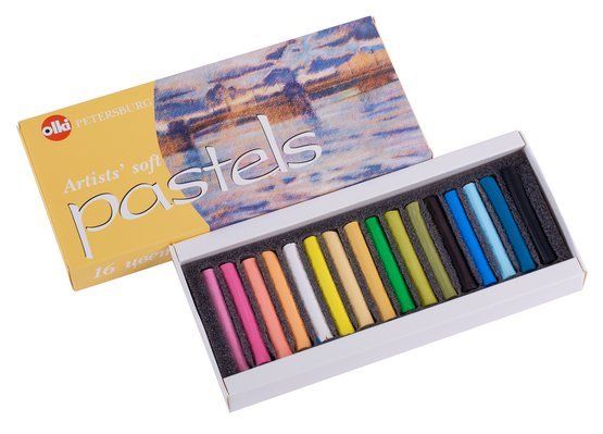 0168 Пастель "Ассорти" №10, 16 цветов Мягкая пастель "ОЛКИ" - разновидность сухой пастели, предназначенная для выполнения работ в традиционной технике. Пастель хорошо ложится на шероховатую основу, легко поддаётся растушёвке, создавая мягкую, бархатистую фактуру поверхности. Наложение пастели плотными слоями позволяет добиваться особой глубины и насыщенности цветового тона. Высокое качество пастели достигается применением тонкодисперсных пигментов и особой сушкой пастельных карандашей. При работе в смешанных техниках мягкая пастель ОЛКИ может быть использована в сочетании с такими водоразбавляемыми материалами, как гуашь, акварель, акрил, чернила. Состав: 304.14 Розово-фиолетовый 301.12 Красный светлый 301.16 Красный светлый 204.14 Оранжевый 101 Белый 202.12 Желтый 205.14 Охра желтая 205.12 Охра желтая 604.10 Травяной зеленый 202.9 Желтый 202.8 Желтый 803.10 Сепия 512.12 Голубой ФЦ 514.16 Бирюзовый 514.9 Бирюзовый 701.10 Черный (цифра после "." означает: больше 10 - разбелы, меньше 10 - учернение (темнее)