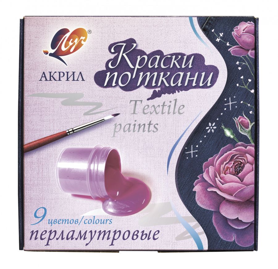 Акриловые краски ЛУЧ по ткани предназначены для декоративных работ по любым видам ткани: натуральным и синтетическим. В наборе 9 цветов: лимонный перламутровый, розовый перламутровый, оранжевый перламутровый, синий перламутровый, фиолетовый перламутровый, изумрудный перламутровый, сиреневый перламутровый, зеленый перламутровый, черный перламутровый. -Перламутровые цвета -Прекрасно смешиваются с любыми другими цветами -Быстро высыхают -Равномерно наносятся -Разбавляются водой в жидком виде -Оптмальная консистенция краски -После термической обработки утюгом, изделие можно стирать при температуре 30-40 градусов С. -Удобные герметичные баночки, предотвращающие высыхание краски Состав краски: водная акриловая дисперсия, пигменты, консервант.