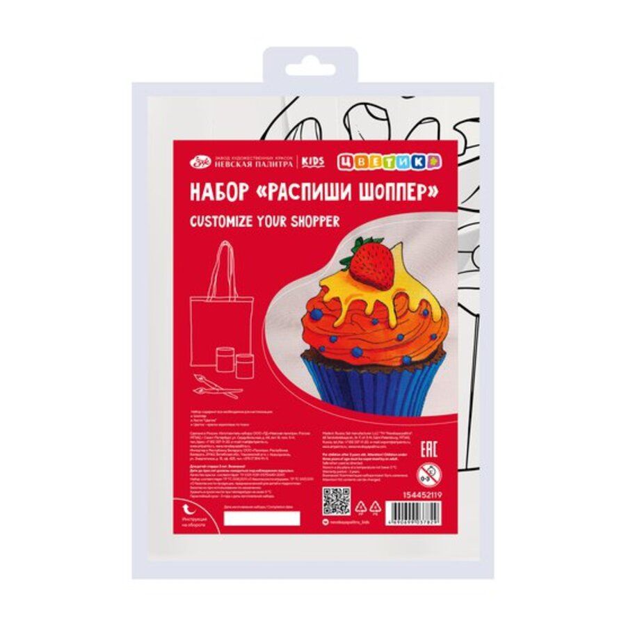 Набор для росписи по ткани Цветик Шопер "Капкейк" включает: - шоппер с ч/б контуром - акриловые краски по ткани Цветик, 5 цв по 20 мл - Набор кистей СИНТЕТИКА"Цветик"3 шт укороченная ручка - Упаковочный пакет, 15*21 см с европодвесом