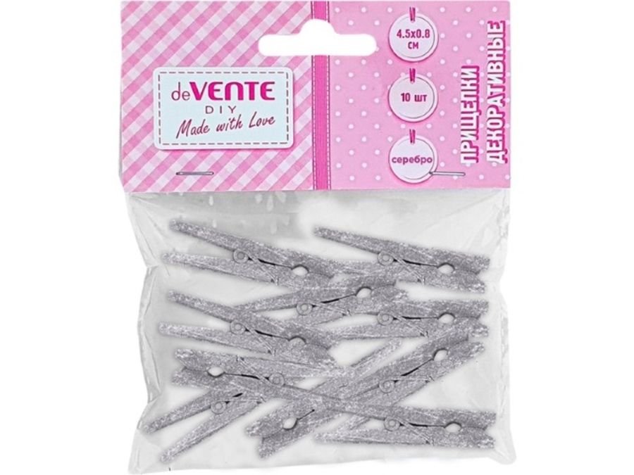 Прищепки декоративные "deVENTE. DIY Silver" деревянные, размер 45x8 мм, 10 шт серебристые металлик, в пластиковом пакете с блистерным подвесом