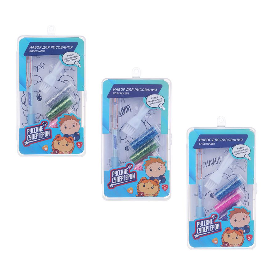 Набор для рисования блестками BY Русские Супергерои "Кавай" отлично подойдёт для маленького художника! В набор входят ручка с клеем, блестки, кисточка и раскраски! Клей-ручка используется для сверхточного склеивания самых мелких деталей. Отлично подходит для дизайнерских и оформительских работ. С помощью такой ручки также можно создавать красивые надписи, просто напишите или нарисуйте, а после посыпьте разноцветным порошком или глиттером. Комплектация: - Блестки - 4 шт. - Ручка с клеем - Кисть - 4 раскраски