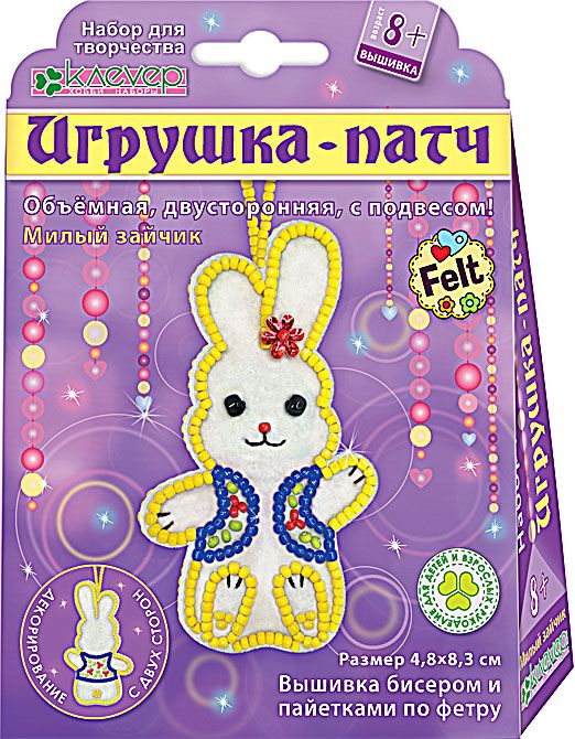 Милый зайчик - стилизованная двусторонняя набивная игрушка из белого фетра, декорированная цветным контрастным бисером и блестящей яркой пайеткой. С помощью набора "Милый зайчик" ребёнок старше 8 лет научится шить простые игрушки и вышивать несложные декоративные узоры: нашьёт на фетр нити с бисером и украсит их пайеткой для акцента, вырежет из фетра стилизованные силуэты, сошьёт их вместе и наполнит синтепухом — получится игрушка-подвес — «солнечный» милый зайчик — брелок для сумочки или брошь.