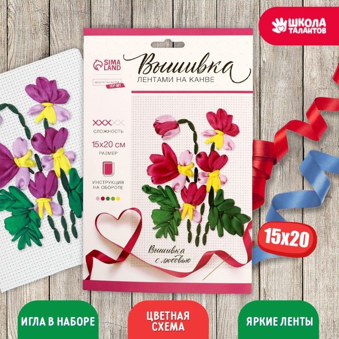 Вышивка лентами — это вид объёмной вышивки, с помощью которой можно создавать картины или декорировать предметы гардероба. Для работы вам потребуется: ножницы, пяльцы (в комплект не входят). Этапы создания картины Закрепите канву в пяльцах, натяните её. Вышивайте, ориентируясь на схему. Размер стежков сопоставляйте с количеством клеток на схеме и канве. Для закрепления ленты выведите её на изнаночную сторону и проденьте иглу под стежками вышивки. Комплектация набор лент игла белая канва схема