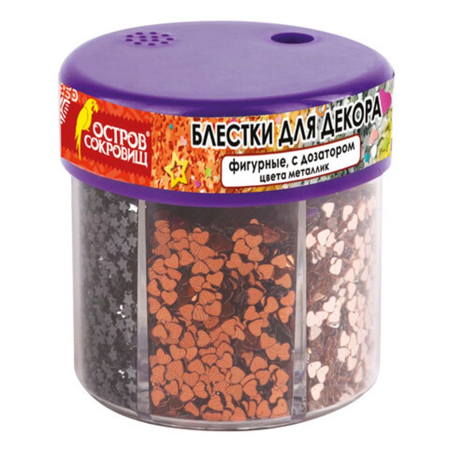 В наборе фигурные блестки разнообразных металлических оттенков: бронза, медь, платина, стальной, золото, серебро. Блестки подходят для любых поверхностей и всех типов красок и лаков. Изготовлены из полиэтилена. Гипоалергенны. Предназначены для детей старше 6 лет. Индивидуальный стикер со штрих-кодом на каждом диспенсере с дозатором. В каждой секции дозатора по 9 грамм блесток.