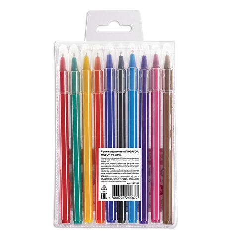 Шариковые ручки ПИФАГОР "Веселые зверята" прекрасно подходят для детского творчества: рисования, поделок и т.д. Набор одноразовых шариковых ручек из 10 цветов: голубой, красный, зеленый, чёрный, розовый, желтый, коричневый, синий, фиолетовый и оранжевый. Удобный шестигранный корпус и яркий дизайн. Цвет корпуса соответствует цвету чернил. Диаметр пишущего узла 0,7 мм создает тонкую линию письма, равную 0,35 мм.