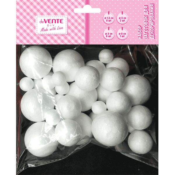 Набор заготовок для декорирования "deVENTE. Шары" из пенополистирола, d=15 мм 8 шт, d=30 мм 6 шт, d=50 мм 2 шт, d=80 мм 1 шт, в пластиковом пакете с подвесом