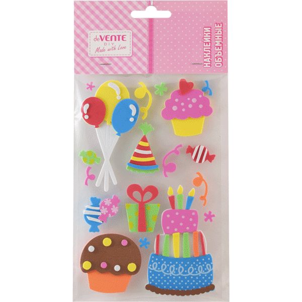 Наклейки объемные "deVENTE. День рождения" из фоамирана, карточка 100x150 мм, в пластиковом пакете с блистерным подвесом