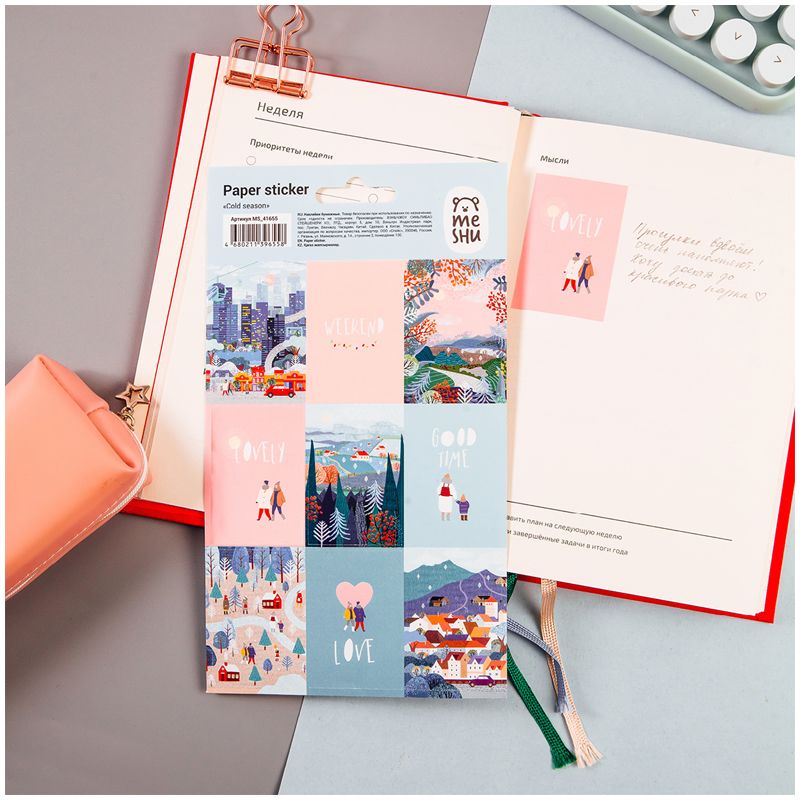 Бумажные наклейки MESHU Cold season – отличный помощник в креативном оформлении записей в блокнотах и дневниках. На листе размером 12*21 см расположены 9 наклеек, изготовленных из самоклеящейся бумаги. Бумажные наклейки подойдут также для украшения канцтоваров, открыток, поделок, телефонов, ноутбуков, предметов интерьера. Яркие современные дизайны от MESHU сделают творческий процесс увлекательным и подарят отличное настроение. Наклейки упакованы в пакет с европодвесом. • Размер листа: 12*21 см; • Количество наклеек: 9.