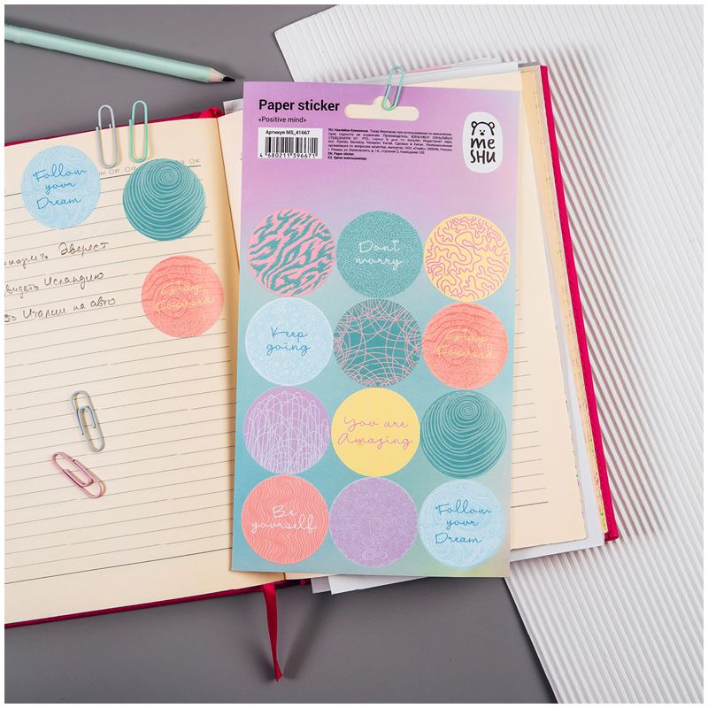 Бумажные наклейки MESHU Positive mind – отличный помощник в креативном оформлении записей в блокнотах и дневниках. На листе размером 12*21 см расположены 12 наклеек, изготовленных из самоклеящейся бумаги. Бумажные наклейки подойдут также для украшения канцтоваров, открыток, поделок, телефонов, ноутбуков, предметов интерьера. Яркие современные дизайны от MESHU сделают творческий процесс увлекательным и подарят отличное настроение. Наклейки упакованы в пакет с европодвесом. • Размер листа: 12*21 см; • Количество наклеек: 12.