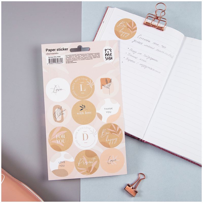 Бумажные наклейки MESHU Soul warmth – отличный помощник в креативном оформлении записей в блокнотах и дневниках. На листе размером 12*21 см расположены 12 наклеек, изготовленных из самоклеящейся бумаги. Бумажные наклейки подойдут также для украшения канцтоваров, открыток, поделок, телефонов, ноутбуков, предметов интерьера. Яркие современные дизайны от MESHU сделают творческий процесс увлекательным и подарят отличное настроение. Наклейки упакованы в пакет с европодвесом. • Размер листа: 12*21 см; • Количество наклеек: 12.