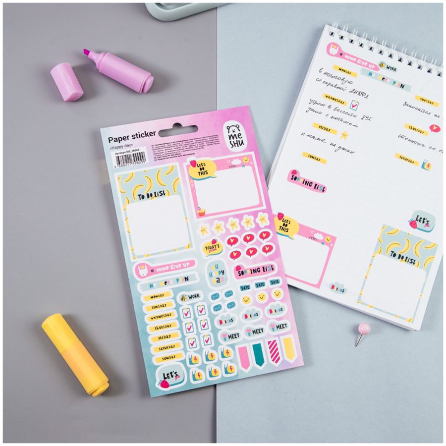 Бумажные наклейки для ежедневников MESHU Happy day – отличный помощник в креативном оформлении записей в блокнотах и дневниках. Наклейки выполнены в милом дизайне и ярких цветах. Лист с наклейками представлен в размере 12*21 см. В упаковке 40-60 наклеек, изготовленных из самоклеящейся бумаги. Бумажные наклейки подойдут также для украшения канцтоваров, открыток, поделок, телефонов, ноутбуков, предметов интерьера. Яркие современные дизайны от MESHU сделают творческий процесс увлекательным и подарят отличное настроение. Наклейки представлены с европодвесом.• Размер листа: 120*210 мм;• Количество наклеек: 40-60