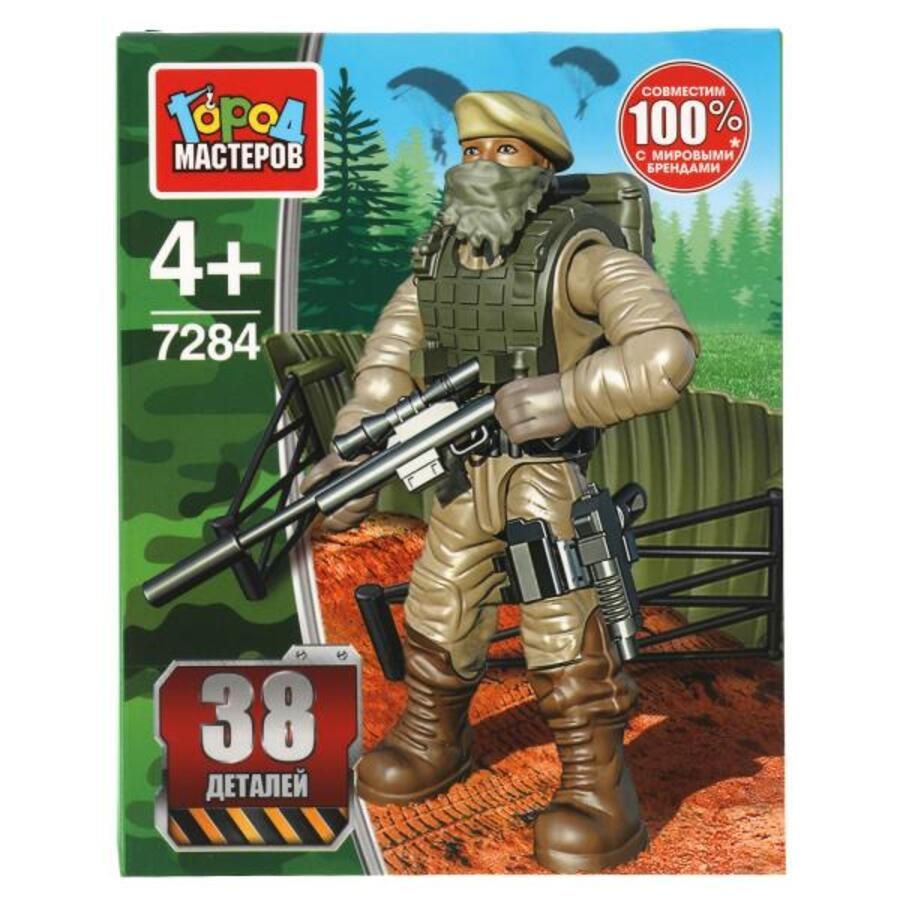 Конструктор «Солдат с парашютом» ТМ «Город мастеров» станет прекрасным подарком для маленького героя. Особенности и комплектация: - 38 деталей - все детали легко и плотно соединяются между собой - совместим с моделями конструкторов мировых брендов С помощью этого занимательного конструктора ребёнок может собрать реалистичную фигурку солдата с парашютом и разнобразными видами оружия. Набор вдохновит малыша на новые увлекательные сюжеты для игр и станет гордостью его игрушечной коллекции. Собирая конструктор ТМ «Город мастеров», ребёнок развивает: - мелкую моторику - мышление - внимание - усидчивость - логику Размер упаковки: 12 x 9 x 4 см. Материал: пластмасса. Рекомендовано детям от 4-х лет.