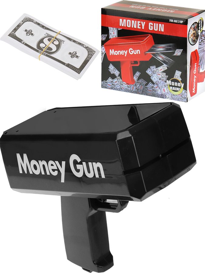 Пистолет с деньгами сможет удивить его владельца и порадовать его друзей. Игрушка станет необычным развлечением на любом празднике, а фальшивые купюры легко можно подменить настоящими и устроить денежный "дождь" из банкнот. Внутри пистолета находится контейнер, в который помещается пачка купюр. Нужно обязательно следить за тем чтобы банкноты, которые вы вставляете в устройство не были порваны или склеены между собой. Размер: 17х19 см. Материал: пластик. Цвет: черный. Упаковка: коробка.
