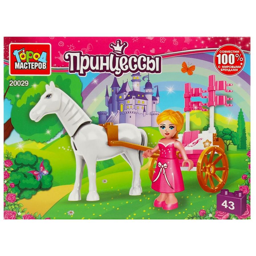 Конструктор «Принцесса с каретой» из серии «Принцессы» ТМ «Город мастеров» понравится вашей малышке. Особенности и комплектация: - 43 детали - 2 фигурки - совместим с моделями конструкторов мировых брендов - все детали легко и плотно соединяются между собой С помощью этого занимательного конструктора ваш ребёнок может собрать красивую карету для принцессы и её лошадки. Набор вдохновит малыша на новые увлекательные сюжеты для игр и станет гордостью его игрушечной коллекции. Собирая конструктор ТМ «Город мастеров», ребёнок развивает: - мелкую моторику - мышление - внимание - усидчивость - логику Размер упаковки: 19 x 14 x 5 см. Материал: пластмасса. Рекомендовано детям от 4-х лет.