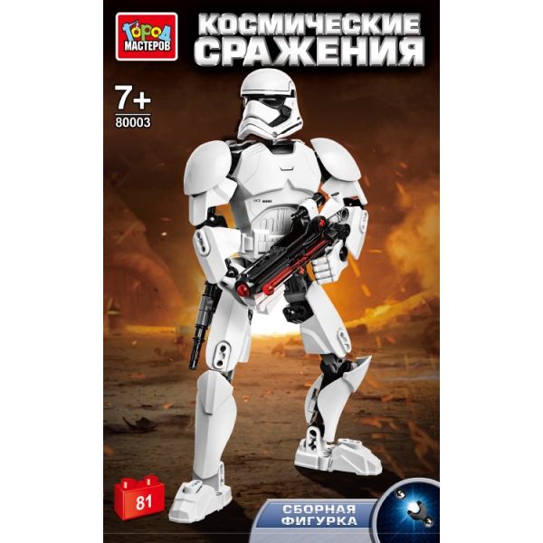 Конструктор – сборная фигурка из серии «Космические сражения» ТМ «Город мастеров» станет прекрасным подарком для юного фантазёра, увлекающегося конструированием или коллекционированием фигурок. Особенности и комплектация: - 81 деталь - высота фигурки 23,5 см - подвижные элементы - высокая детализация - в комплекте оружие, его можно крепить к бедру фигурки - оружие «стреляет» - все детали легко и плотно соединяются между собой - совместим с моделями конструкторов мировых брендов С помощью данного набора ребёнок сможет собрать фигурку персонажа известной космической саги. У фигурки имеются подвижные элементы (шарнирное соединение), что сделает игру с ней ещё интереснее и разнообразнее. В серию входит несколько персонажей – собрав коллекцию, можно разыграть сюжеты по мотивам фильма и расширить варианты игры. Собирая конструктор ТМ «Город мастеров», ребёнок будет развивать: - мелкую моторику - мышление - внимание - усидчивость - логику Размер упаковки: 26 х 17 х 7 см. Материал: пластмасса. Рекомендовано детям от 7-ми лет.