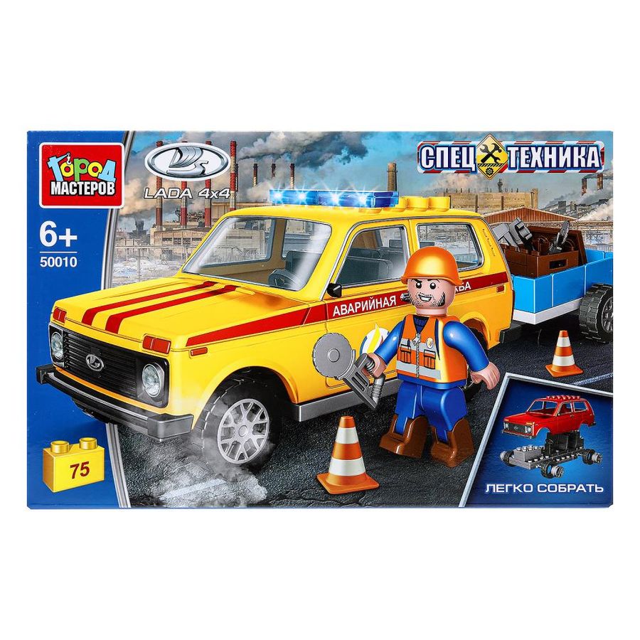 Конструктор «Lada Нива с прицепом. Аварийная служба» из серии «Спецтехника» ТМ «Город мастеров» понравится маленьким автолюбителям. Особенности и комплектация: - 75 деталей - фигурка - легко собрать - совместим с моделями конструкторов мировых брендов - все детали легко и плотно соединяются между собой С помощью этого занимательного конструктора ваш ребёнок может собрать реалистичную модель машины. Набор вдохновит детей на новые увлекательные сюжеты для игр и станет гордостью их игрушечной коллекции. Собирая конструктор ТМ «Город мастеров», ребёнок развивает: - мелкую моторику - мышление - внимание - усидчивость - логику Размер упаковки: 25 x 16 x 5 см. Материал: пластмасса. Рекомендовано детям от 6-ти лет.