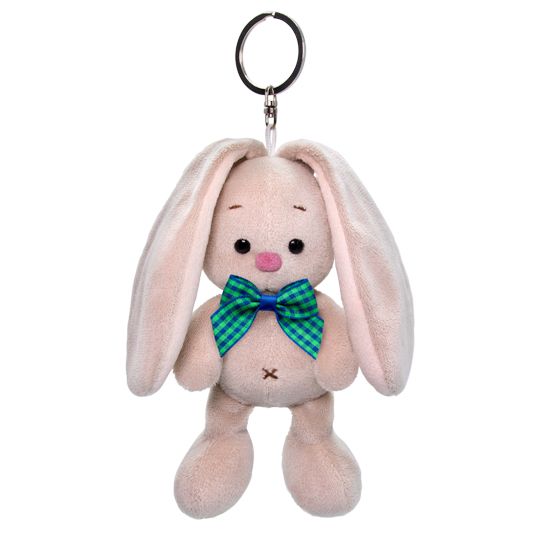 Миниатюрная версия игрушки Зайка Ми воплощена в виде брелка с креплением - кольцо. На шее у малыша аксессуар - бантик из бирюзовой ленты в мелкую синюю клеточку.