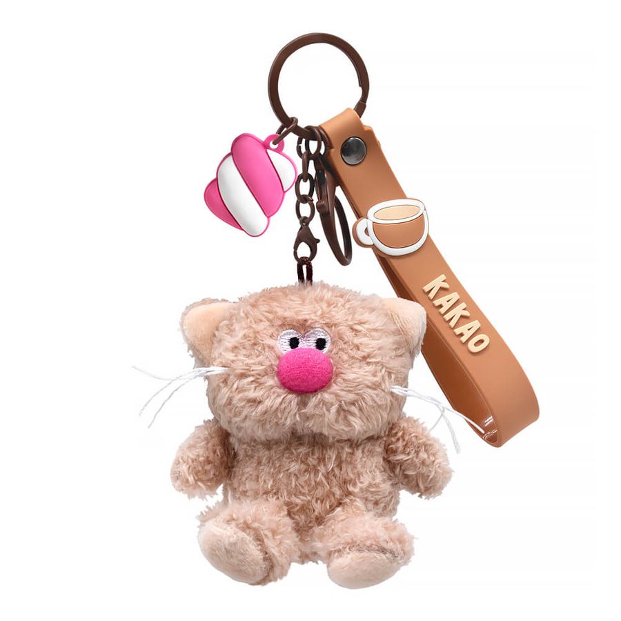 Кот брелок Какао. Брелок сшит из тактильно приятного эко меха цвета какао. Усики из шелковистого кручёного шнура. Объемный носик обтянут розовым софтом. Глазки вышиты. На пяточках и внутри ушек вшит молочный софт. Брелок крепится на кольцо шоколадного цвета с силиконовыми подвесами. Один подвес – это браслет с хештегом «специальноДЛЯтебя» на кнопке и с фирменным логотипом «Кофейные коты». Другой подвес – бело‑розовая карамель‑тянучка. Размер — 7,5 см