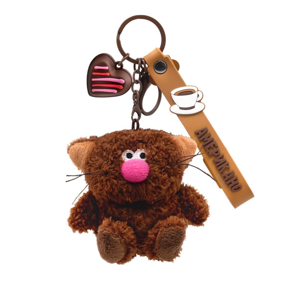Кот брелок Американо. Брелок сшит из тактильно приятного эко меха коричневого цвета. Усики из шелковистого кручёного шнура. Объемный носик обтянут розовым софтом. Глазки вышиты. На пяточках вшит темно‑коричневый софт, а внутри ушек карамельный софт. Брелок крепится на кольцо шоколадного цвета с силиконовыми подвесами. Один подвес – это браслет с хештегом «вместоЗАРЯДКИ» на кнопке и с фирменным логотипом «Кофейные коты». Другой подвес – шоколадка в виде сердечка с розовыми кремовыми полосками. Размер — 7,5 см