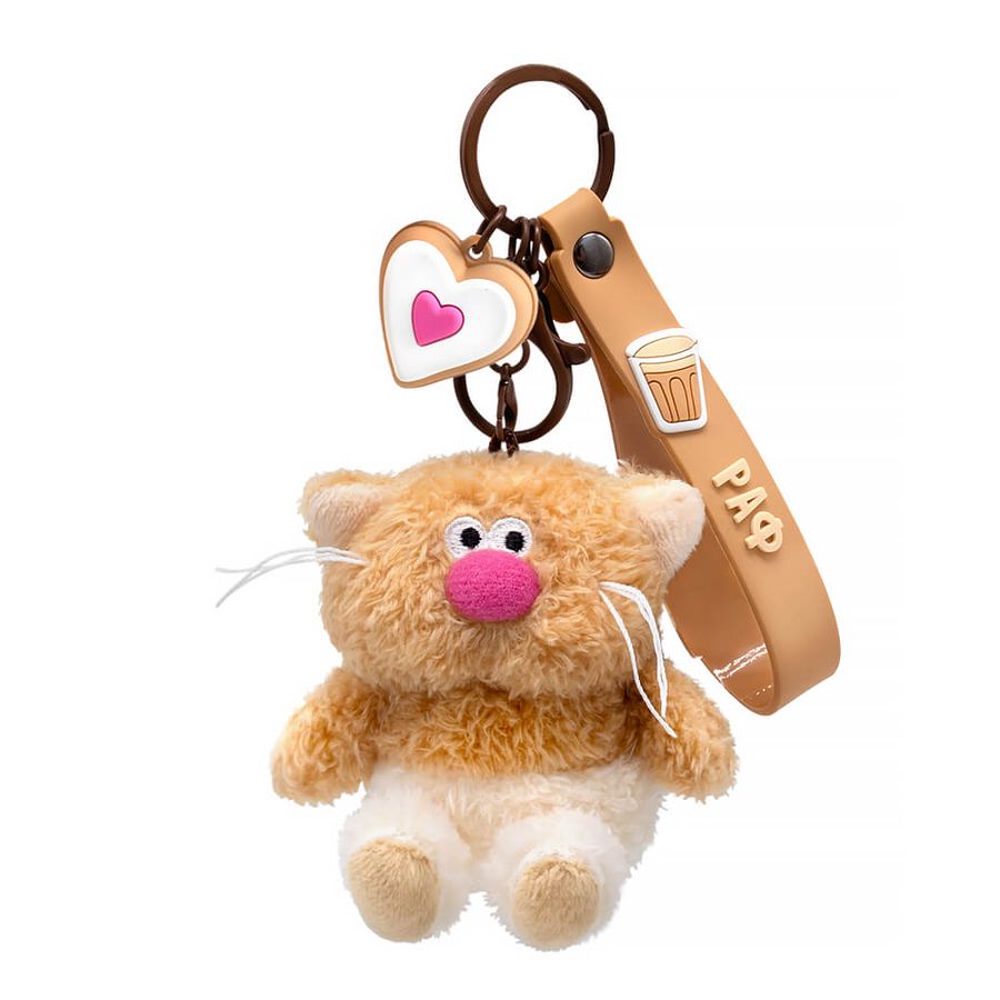 Кот брелок Раф. Брелок сшит из тактильно приятного эко меха в двух оттенках: цвета песочного печенья и цвета топленого молока. Усики из шелковистого кручёного шнура. Объемный носик обтянут розовым софтом. Глазки вышиты. Пяточки из софта цвета крема, а внутри ушек софт сливочного цвета. Брелок крепится на кольцо шоколадного цвета с силиконовыми подвесами. Один подвес – это браслет с хештегом «МЕЧТАЙмасштабно» на кнопке и с фирменным логотипом «Кофейные коты». Другой подвес – печенье в виде сердечка с белым кремом сверху и розовым сердечком в середине. Размер — 7,5 см