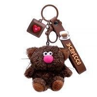 Кот брелок Фраппе. Брелок сшит из тактильно приятного эко меха в трех оттенках: цвета горького шоколада, цвета золотистой карамели и белоснежного цвета молочной пенки. Усики из шелковистого кручёного шнура. Объемный носик обтянут розовым софтом. Глазки вышиты. Пяточки и внутри ушек софт шоколадного цвета. Брелок крепится на кольцо шоколадного цвета с силиконовыми подвесами. Один подвес – это браслет с хештегом «счастьеВмоменте» на кнопке и с фирменным логотипом «Кофейные коты». Другой подвес – венская вафелька, политая шоколадом с посыпкой. Размер — 7,5 см