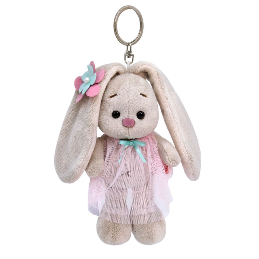 Миниатюрная версия игрушки Зайка Ми в виде брелока. На Зайке легкое розовое платье из двух слоев сеточки, украшенное маленьким мятным бантиком. На ушке — аксессуар в виде цветочка с бусиной‑жемчужиной.