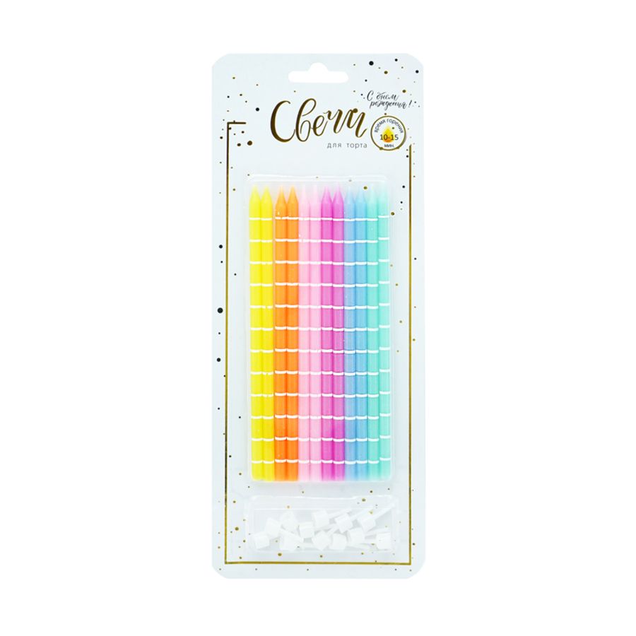 Свечи в торт — незаменимый атрибут для празднования Дня рождения. Если в свой День рождения задуть все свечи на торте и загадать при этом желание, то оно обязательно сбудется! Свечи тортовые классические XL Полоски (Ассорти) с держателями (длинные свечи) подойдут для празднования дня рождения всех возрастов. Удобная упаковка в блистере с фольгированным тиснением с лаконичным поздравлением еще больше привлечет внимание Ваших потенциальных покупателей и предоставляет дополнительные преимущества при размещении свечей в торговой точке. Свечи упакованы в праздничную фирменную подложку ВЕСЕЛУХА с фольгированным тиснением. Набор: 12 шт. Размер: 15 см. Внимание! На декоративных свечах с лаковым покрытием от резких перепадов температур или при низкой температуре (ниже -20) может отслоиться лак. При транспортировке в зимнее время года рекомендуется при получении свечей открыть коробки в теплом помещении, и дать постоять открытыми в течении суток, не перемещая свечей.