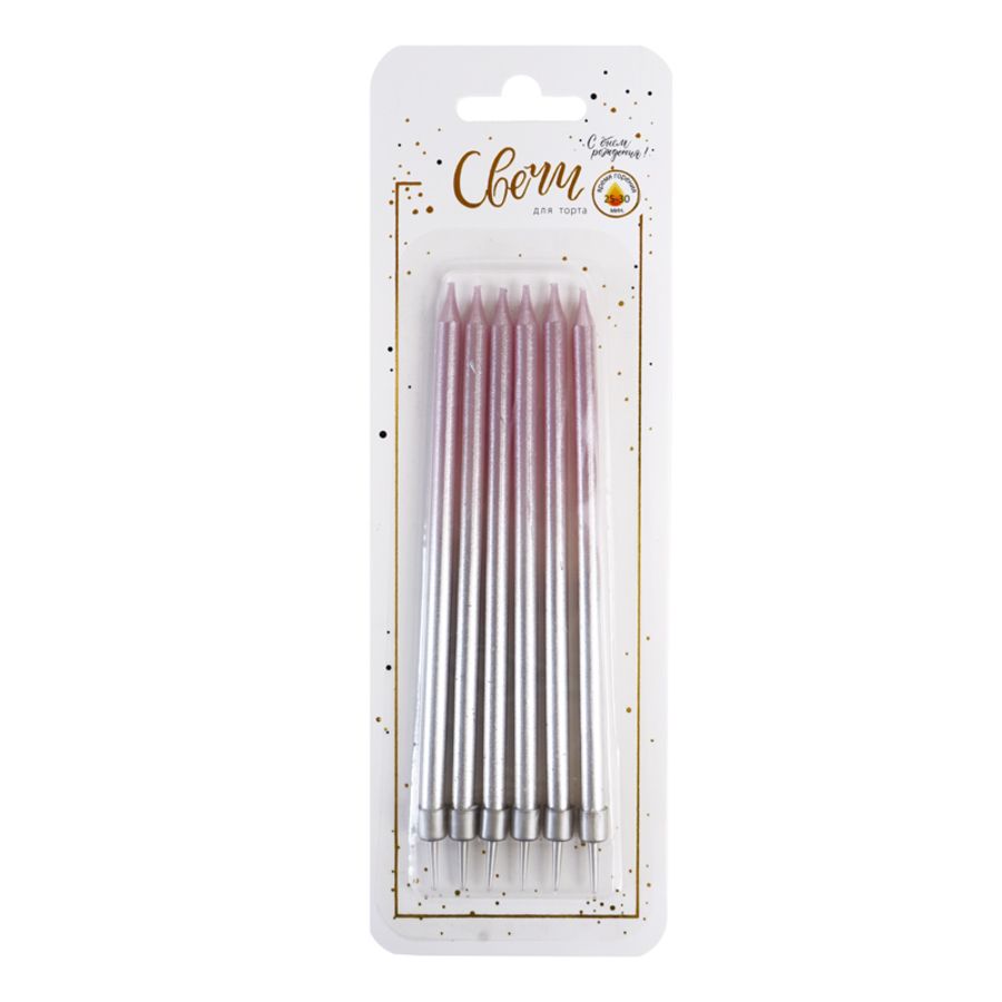 Свечи тортовые классические XL "Градиент" Серебро с розовым металлизированные с держателями / 6 шт., 13 см / (Китай).